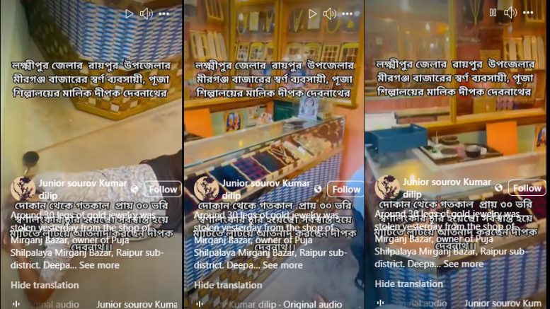 Deepak Debnath is a gold trader by profession and the owner of a gold jewelry store named Puja Shilpalaya located at Mirganj Bazar of Raipur Upazila, Lakshmipur District in Bangladesh. He sells gold ornaments at his store where all the ornaments are also stored. Deepak is a Hindu by religion in Bangladesh where Hindus are being frequent target of violent attacks with full support of the government since August 5, 2024. Looting and robbing of Hindu wealth is a common form of attack by Muslim Extremists.