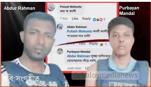 The incident occurred recently around a religious post on Facebook on the occasion of the annual Hindu religious festival Kali Puja. A Hindu Facebook user posted a devotional greetings to Hindu Goddess Kali. The accused Muslim youth Abdur Rahman commented to that post using foul and obscene language about Goddess Kali that reads “Clap your hands at the death of Kali (in Bangla: কালী কালীর শাওয়ায় মার তালি।)”. The comment immediately sparked outrage among Hindu people who called it as a serious blow to religious sentiments. The Hindu youth Purbayan Mandal posted a response to Abdur Rahman’s comment on Facebook that reads “Kick the ass of the lustful womanizer Mohammad (in Bangla: লুচ্ছা মাগিখোর মোহাম্মদের গাঁড়ে লাথি।)”